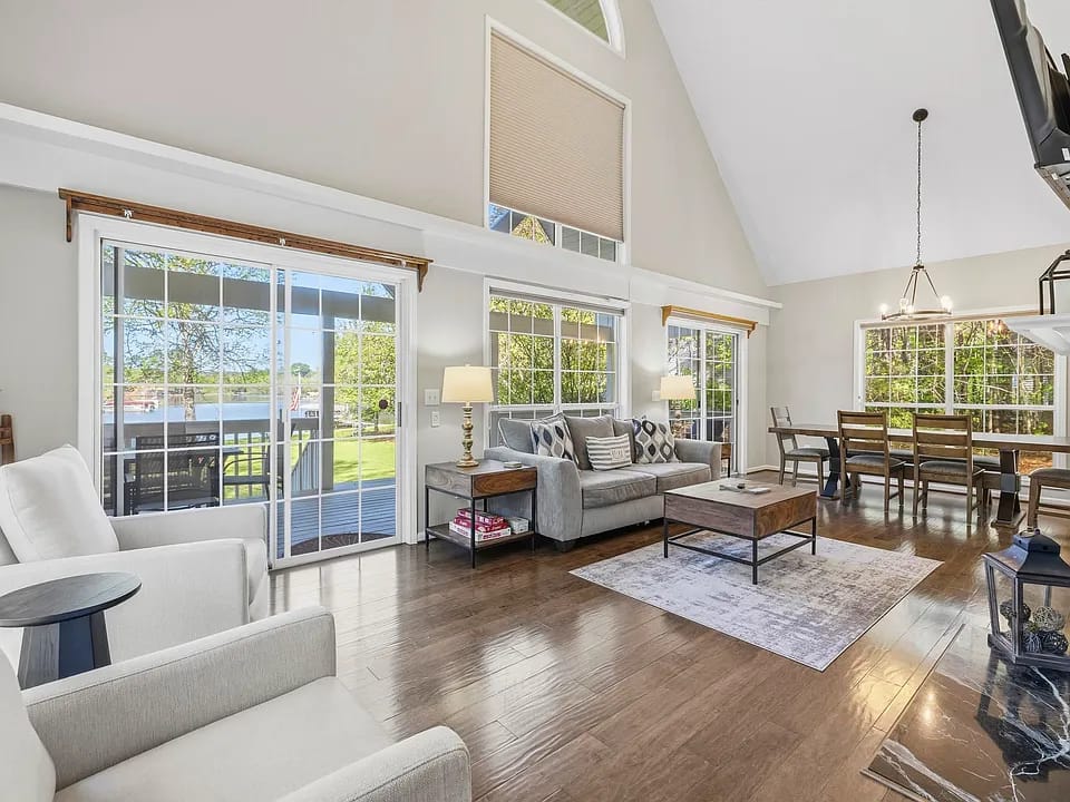 βοΈ Wall of windows with vaulted ceilings flooding the open living area with natural light