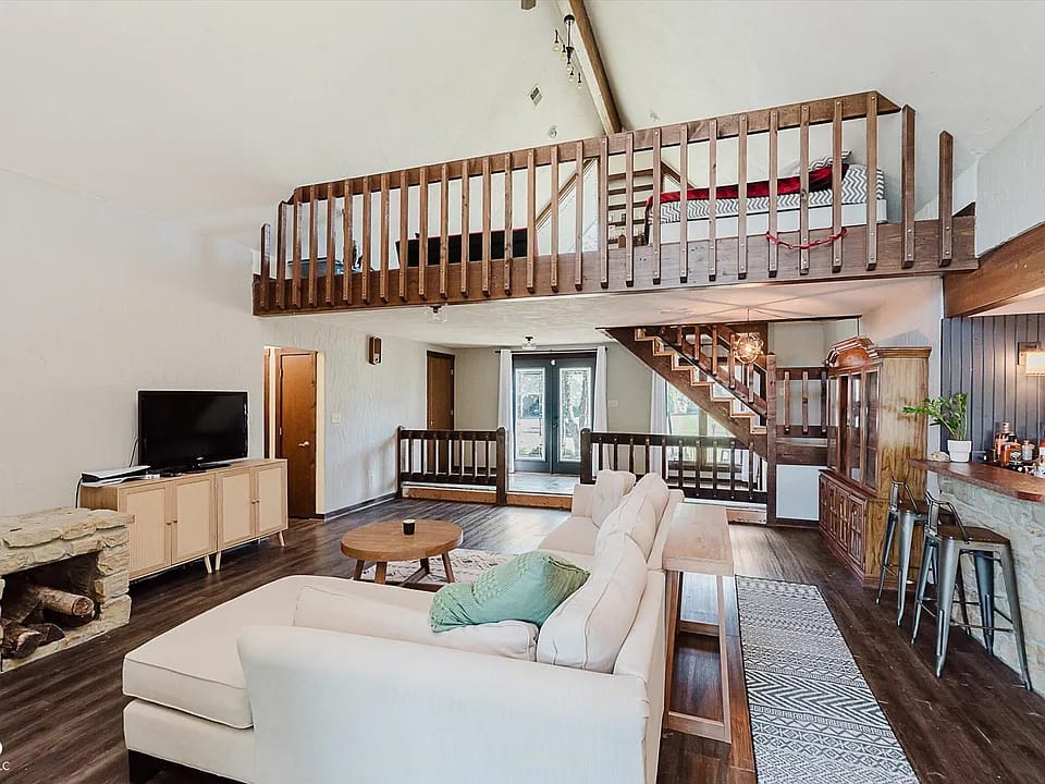 β’ π₯ Floor-to-ceiling stone fireplace + wet bar + wood laminate throughout