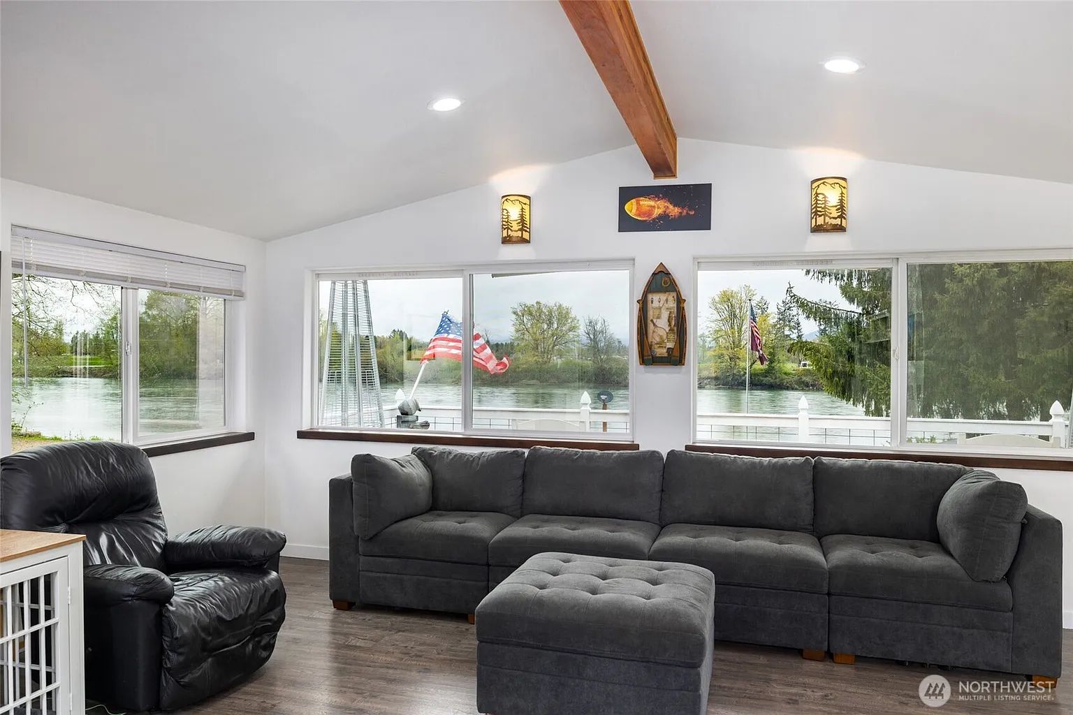 π Spacious deck and patio extending living outdoors along the Skagit River
