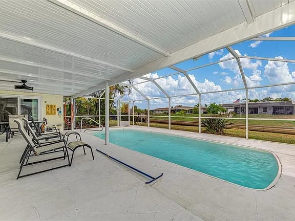 🏊 Sparkling pool with outdoor kitchen, bar, and multiple covered seating areas overlooking the water