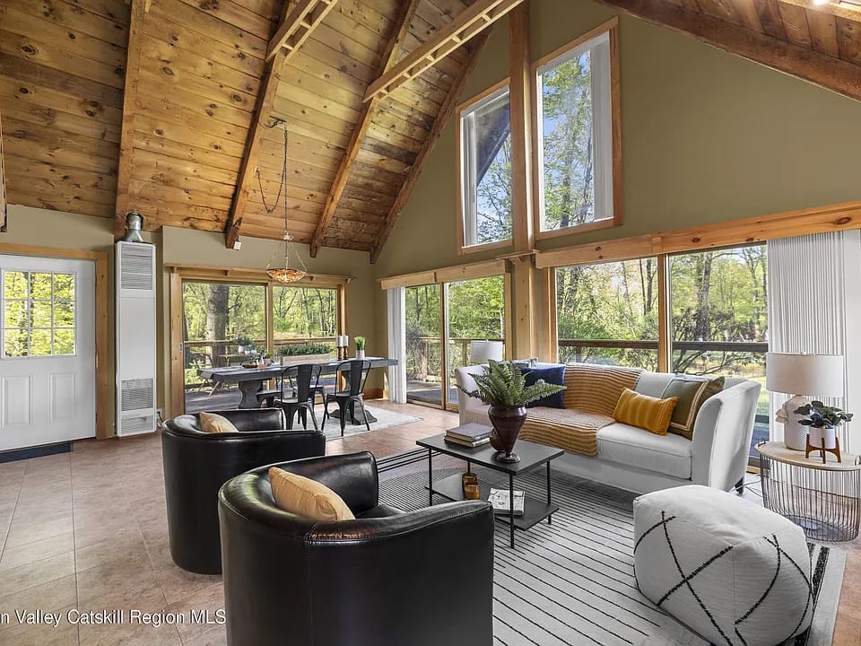 โณ๐ง $425,000 โ a chalet on the 7th green AND Rondout Creek. Floor-to-ceiling windows + wrap deck.